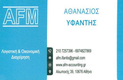 Η εταιρεία Accounting & Financial Manager (AFM) δραστηριοποιείται στο χώρο των λογιστικών και φοροτεχνικών υπηρεσιών, από το 1997, με την παροχή στους πελάτες της πλήρους λογιστικής, φοροτεχνικής, συμβουλευτικής και νομικής υποστήριξης.