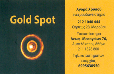 Αγορά Χρυσού ενεχυροδανειστηριο λίρες κοσμήματα ασημικά ρολόγια διαμάντια κτλ τηλέφωνο 2111828800 Λ. Μεσογείων 76, Αθήνα και στο κεντρικό μας στο Μαρούσι Θησέως 28 και τηλέφωνο 2121040444 εξυπηρετουμε όλο 24 ωρο Goldspot19 [at] gmail.com (Goldspot19[at]gmail[dot]com) www.goldspot.gr