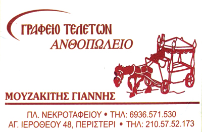 Το γραφείο του κ.Μουζακίτη Ιωάννη, διαθέτοντας εμπειρία ετών,με έδρα το Περιστέρι δραστηριοποιείται σε όλο το νομό Αττικής αλλά και σε όλη την Ελλάδα. Βρισκόμαστε δίπλα σας στη δύσκολη στιγμή, προσφέρονταςσυμπαράσταση και κατανόηση για την κατάσταση που βιώνετε. Διακρινόμαστε για την ευαισθησία που διαθέτουμε απέναντι στο θέμα τηςαπώλειας και προσεγγίζουμε εσάς και την οικογένειά σας μεσκοπό την απόλυτη εκπλήρωση κάθε επιθυμίας σας. Σε μια τόσο άβολη και οδυνηρή στιγμή της ζωής, που αναπάντεχα έρχεται,σε κάποια χρονική συγκυρία, είναι χρήσιμο να υπάρχει κάποιος πουμπορεί να μας μιλήσει και να μας εξηγήσει κάποια βασικά πράγματα.Για αυτό ακριβώς φροντίζουμε, πάνω από όλα, εμείς.Να σας προετοιμάσουμε και να σας καθησυχάσουμε, για τις δύσκολες ώρες.Αποστολή μας είναι, βέβαια, και να διεκπεραιώσουμε κάθε πρακτικό ζήτημα και διαδικασία.Πάντοτε με απόλυτο επαγγελματισμό και εμπειρία πολλών ετών, φροντίζουμε τα πάντα για εσάς. Οι άνθρωποι του γραφείου μας αναλαμβάνουν κάθε διαδικασίακαι στέκονται δίπλα σας πριν, κατά τη διάρκεια, και μετά την τελετή. Αναλαμβάνουμε τον ανθοστολισμό της εκκλησίας, του τάφου καθώςεπίσης και το χώρο όπου βρίσκεται η σωρός με άνθη της αρεσκείας σας.Στο χώρο του ανθοπωλείου μας εντός Πλατείας Κοιμητηρίου έχετε τη δυνατότητανα επιλέξετε ανάμεσα σε μια μεγάλη γκάμα αληθινών και τεχνητών λουλουδιών.